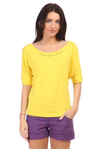 Яркая желтая блуза свободного покроя, модель с короткими рукавами, имеющими прорези, с большой округлой горловиной, которая украшена металлизированными стразами.